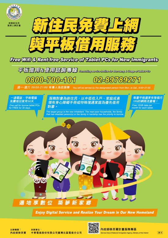 這個服務係提供新住民免費上網及平板借用,只要符合新 住民身分者,撥打專線完成預約或至內政部移民署25個服 務站申請,平板電腦即宅配到府,每月並享有10G網路流 量;另若為中低收入戶或特殊境遇家庭或家中有身心殘障 成員之新住民朋友,更能享有優先借用服務。