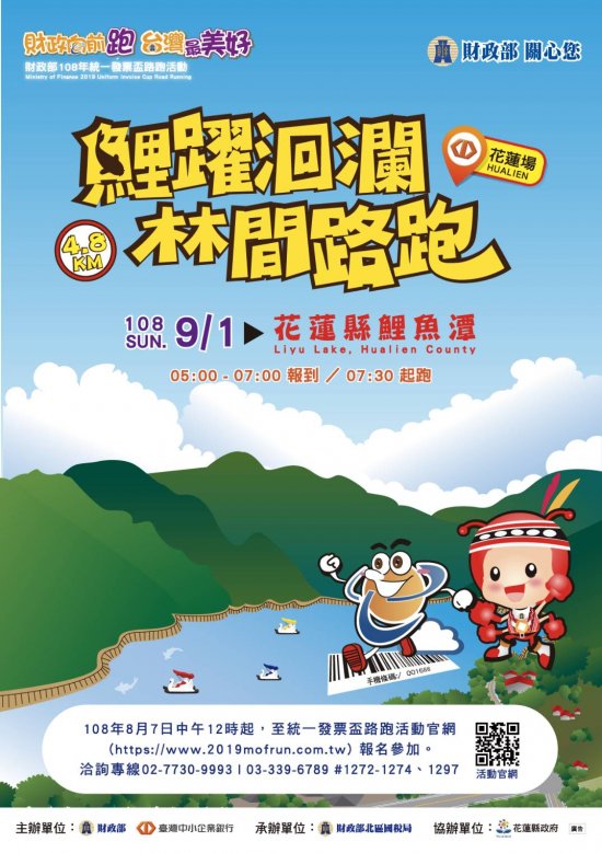 縣府轉知財政部辦理「108年統一發票盃花蓮場路跑活動」,敬邀各校共襄盛舉並踴躍報名參加,請查照。