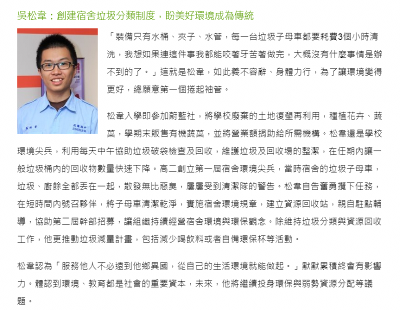 松韋學長在高中時曾獲得保德信志工全國志工菁英獎