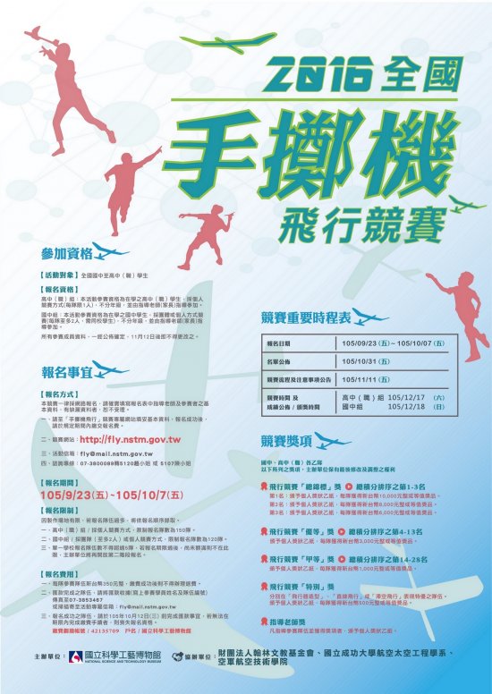 主旨: | 國立科學工藝博物館主辦之「2016年全國手擲機飛行競賽」自105年9月23日開始接受報名,公告並鼓勵學生踴躍報名參賽。 |