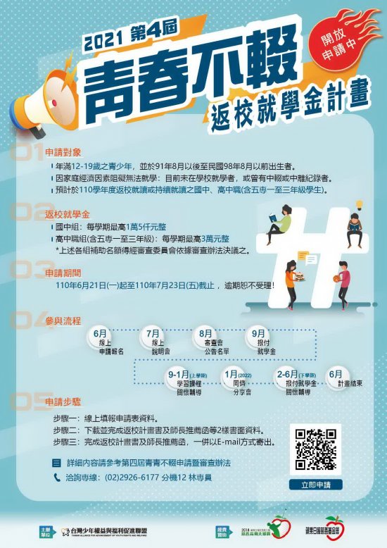 二、本計畫於民國110年06月21日至民國110年07月23日開放申請,並於7月13日辦理線上說明會。詳細申請辦法及參與線上說明會請見活動網站:https://www.youthrights.org.tw/news/1803。