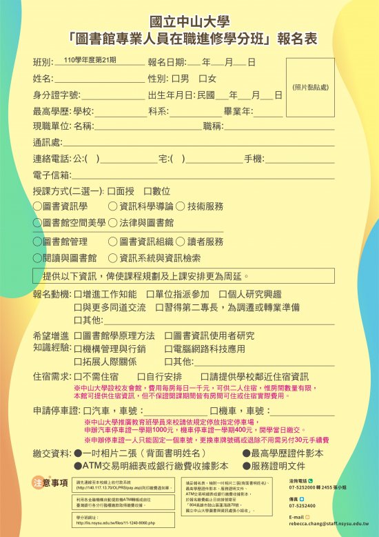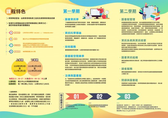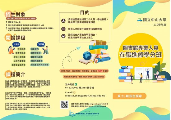 國立中山大學圖書與資訊處辦理「第21期圖書館專業人員在職進修學分班」上學期招生簡章,歡迎有興趣的老師報名參加。