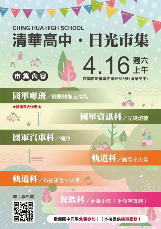 四、如欲參加日光市集者,請掃描QRCODE報名或紙本報名(輔導處可以協助傳真),桃園市學生可提供接車服務、外縣市同學統一於富岡火車站乘車(接駁車08:30發車前往本校),相關事宜請聯繫該校教務處。(陳昭宏主任03-4771196轉分機220)。