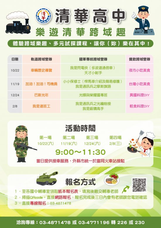四、如欲參加「樂遊清華跨域趣」多元試探課程者,請掃描QRCODE報名或至利用紙本報名,桃園市學生參加者可提供接車服務、外縣市同學統一於富岡火車站乘車(接駁車08:00發車前往本校),相關事宜請聯繫該校學務處。(姜佑旻老師4771196分機230)。