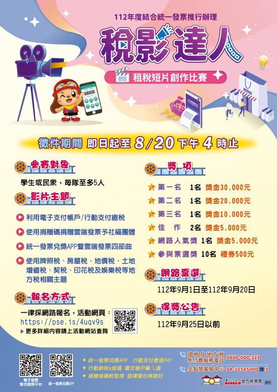 臺中市政府地方稅務局辦理112年度「稅影達人」租稅短片創作比賽活動,請學校師生踴躍參加。