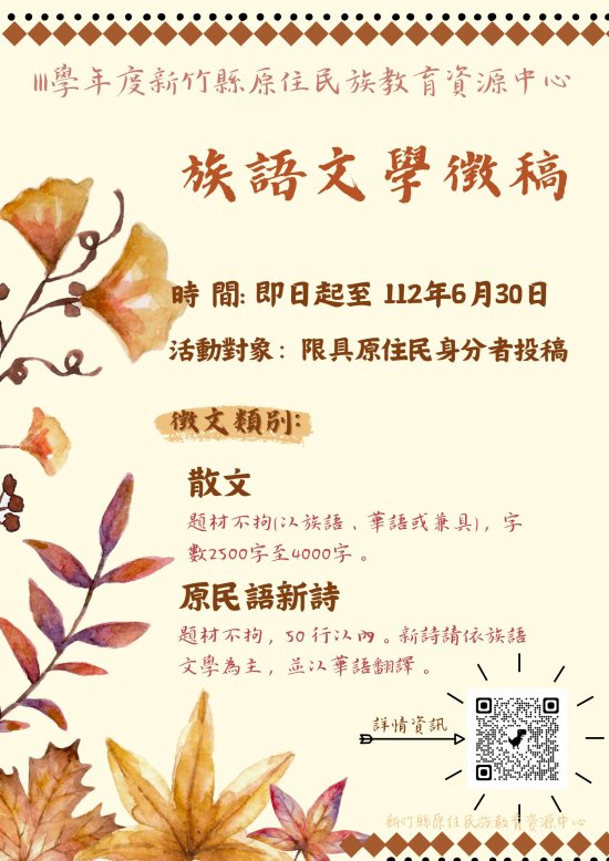 2、 原民語新詩:題材不拘,50 行以內。新詩請依族語文學為主,並以華語翻譯。