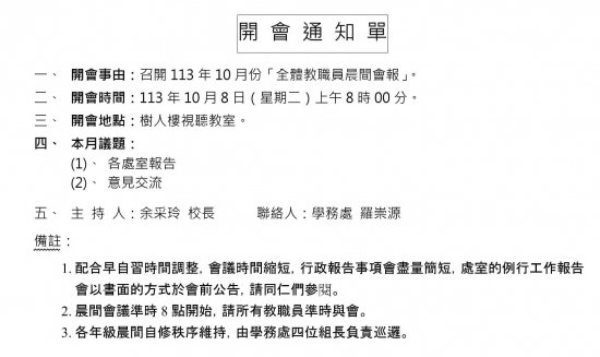 一、依據本校學務處10月晨報開會通知辦理。 二、請各位同仁務必依開會通知上所訂時間完成簽到作業,勿遲到、早退或無故未到,倘因故無法到場者,請先行報告校長同意後得免參加會議,113年10月8日晨間會報時間為本校重要活動集會,現場將實施簽到退作業,拜託同仁務必遵守本校及花蓮縣政府相關差勤管理規範,萬分感謝大家的配合