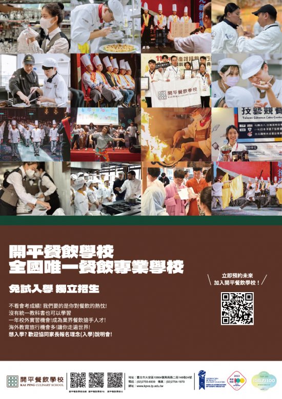 一、為使更多國中學生對技職教育深入瞭解,該校辦理「實體理念說明會」及「線上理念說明會」,提供學生、家長認 識本校教育理念與餐飲教學特色,協助增進國中學生及其 家長對職業類科升學管道及學習內容之試探,期望開平優秀學子成為臺灣及國際餐飲界之人才。