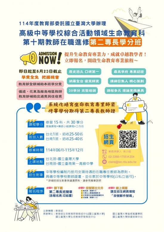 【訊息轉知】轉知教育部委託國立臺灣大學生命教育研發育成中心辦理「114年度高級中等學校綜合活動領域生命教育科第十期教師在職進修第二專長學分班」