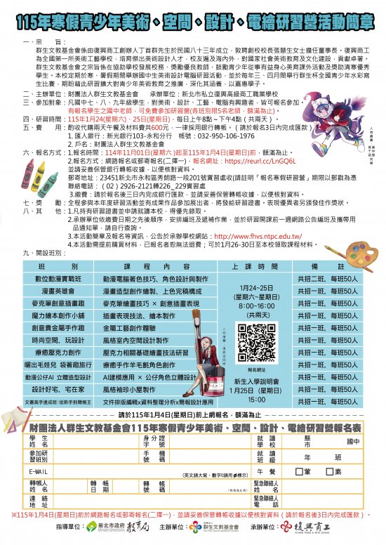 七、 報名時間:114年11月01日(星期六)起至115年1月04日(星期日)前,額滿為止。 任何課程相關問題,聯絡電話(02)2926-2121轉226~229。