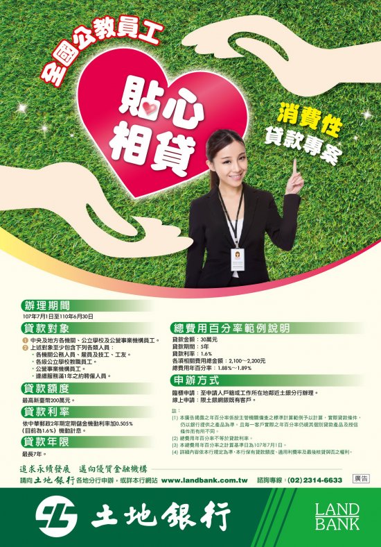 二、「貼心相貸」-全國公教員工消費性貸款(以下簡稱本貸款),原由土地銀行依約承作至107年6月30日止,經重行辦理公開徵選金融機構承作後,由土地銀行再度獲選接續為公教同仁提供服務,辦理期間自107年7月1日起至110年6月30日止,為期3年。
